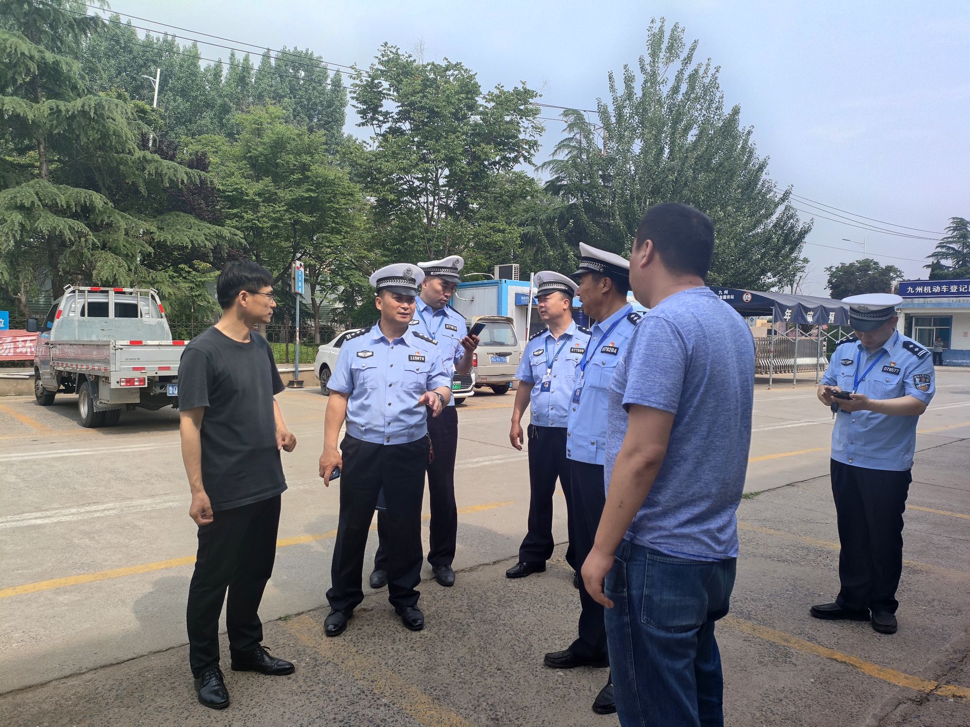 5月31日上午,市車管所副所長(zhǎng)宋增明、楊小峰,市車管直屬二分所所長(zhǎng)鄔寬海一行到九州機(jī)動(dòng)車登記服務(wù)站調(diào)研指導(dǎo)車管業(yè)務(wù)工作,汽貿(mào)公司總經(jīng)理張佃波、副總經(jīng)理佘江濤陪同調(diào)研。