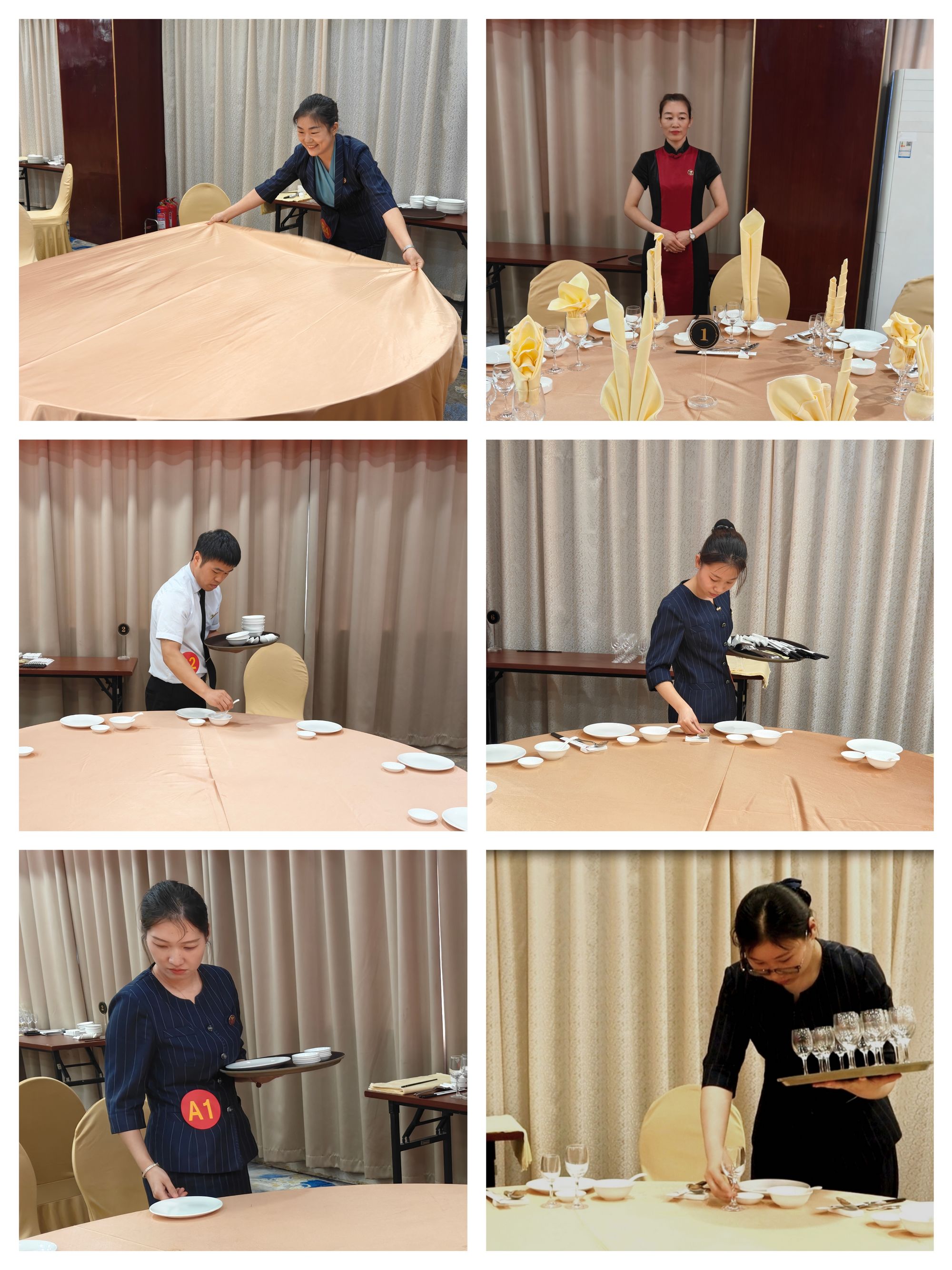 本次技能比武項目為餐廳中餐宴會(huì )擺臺,比賽分為員工組和基層管理人員組,現場(chǎng)抽簽決定參賽順序。賽場(chǎng)上,選手們全神貫注,在規定的時(shí)間內,憑借自己的專(zhuān)業(yè)技能,將一張張普通的餐桌布置成既美觀(guān)又實(shí)用的用餐環(huán)境。鋪桌布時(shí)行云流水,定位餐具時(shí)快速均,餐巾折花綻放栩栩如生的造型,每一個(gè)細節都彰顯著(zhù)選手們扎實(shí)的功底與精益求精的技藝。經(jīng)過(guò)評委綜合評比,開(kāi)發(fā)區店餐廳部薛會(huì )娜和陳彩霞分獲基層管理人員組和員工組第一名;宗龍星、丁朝陽(yáng)分獲基層管理人員組第二、第三名,付振云、房桂宇分獲員工組第二、第三名。