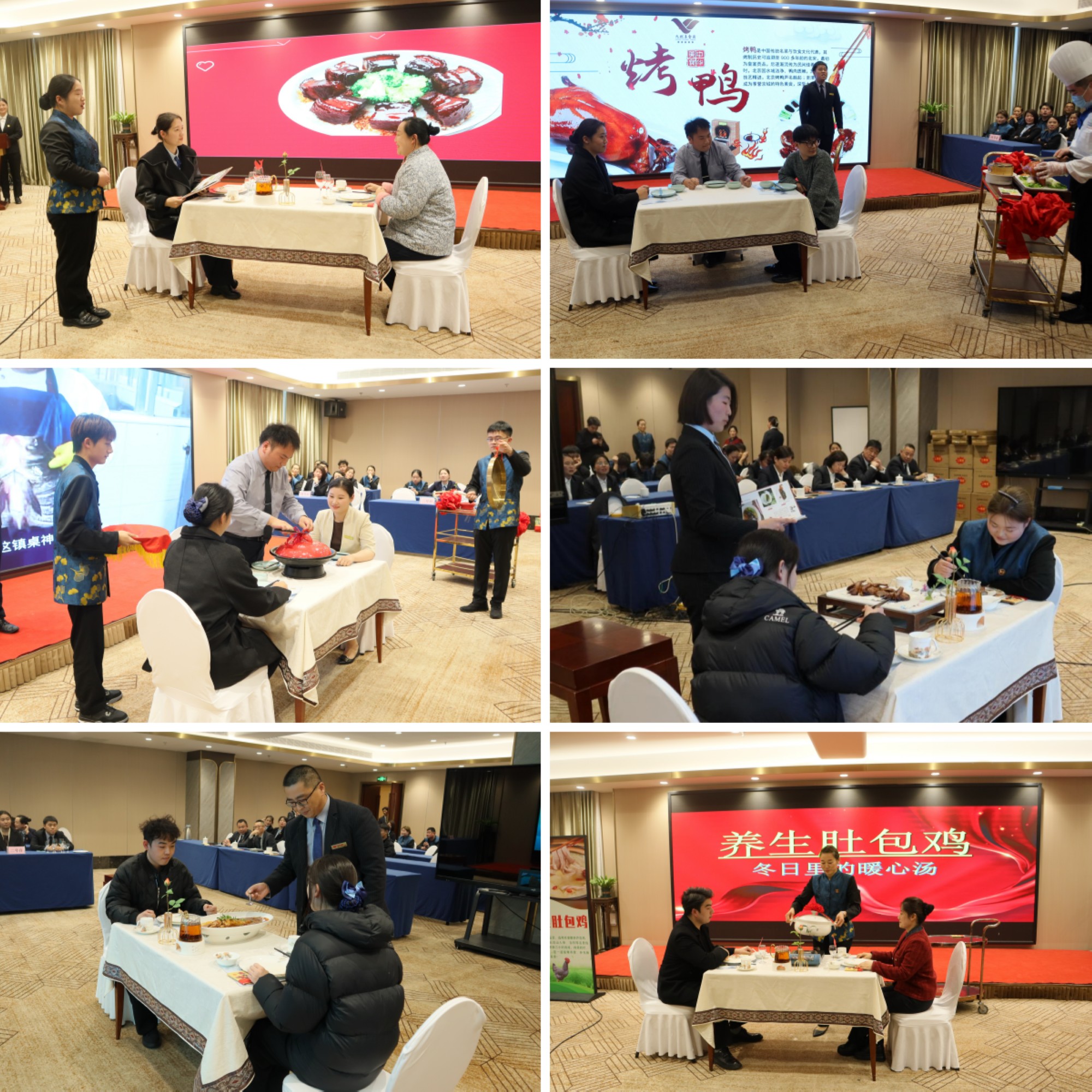 本次競賽設有必答題、搶答題和情景模擬等環(huán)節;必答題環(huán)節選手按順序獨立作答,檢驗菜品知識儲備;搶答題環(huán)節既要配合搶答又要熟練掌握菜品特色,節奏緊湊、你來(lái)我往,充分展現出比拼的激烈;情景模擬環(huán)節聚焦貴妃紅燒肉、九州烤鴨、黃燜胖魚(yú)頭、脆皮乳鴿、膠東燜魚(yú)、養生肚包雞等賓館招牌經(jīng)典菜,現場(chǎng)演繹服務(wù)場(chǎng)景、介紹菜品特色及文化,贏(yíng)得陣陣掌聲。