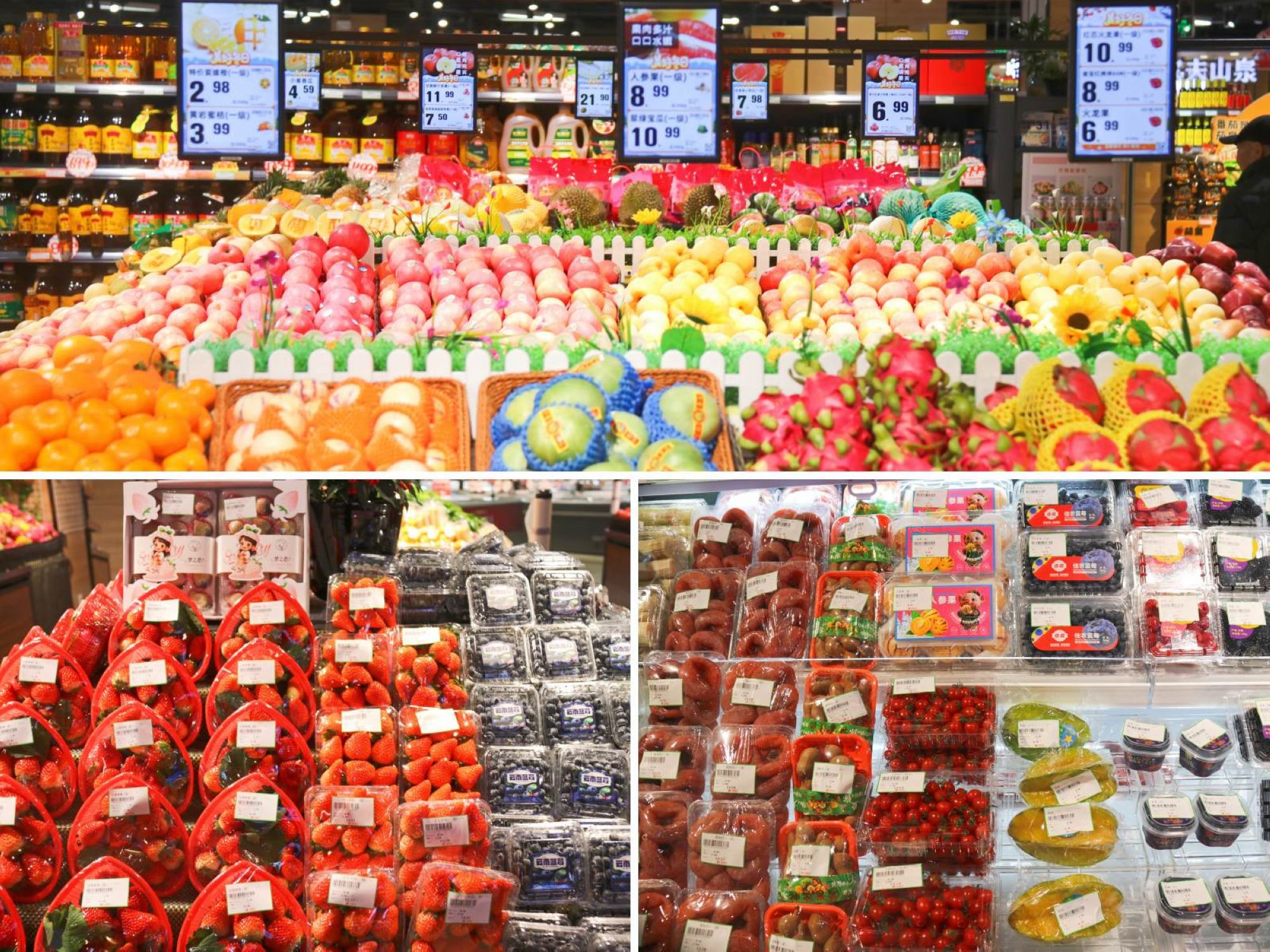 水果區重新規劃陳列布局,種類(lèi)更豐富。全面啟用電子價(jià)簽,實(shí)現價(jià)格實(shí)時(shí)更新。