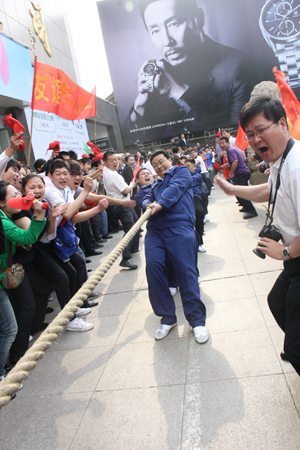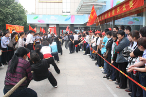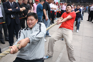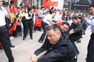 5月16日,“和諧九州”拔河比賽在九州大廈門(mén)前廣場(chǎng)舉行,九州商業(yè)大廈、臨沂賓館、九州連鎖超市公司、九州宜家佳、九州汽車(chē)銷(xiāo)售公司、集團行政等六支代表隊參加比賽。